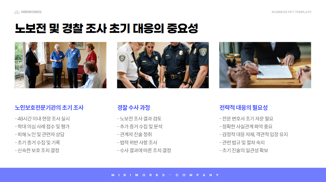 학대 신고가 접수되면 아동보호전문기관이나 유사 기관이 먼저 조사를 시작합니다. 이후 경찰이 수사에 착수하는데, 이때의 진술과 초기 자료가 향후 형사재판과 행정조치에 큰 영향을 미칩니다. 즉, 이 단계부터 대구 노인학대 변호사 의 전략적 개입이 필수적이며, 단순 해명이나 감정적 대응은 사태를 더욱 복잡하게 만들 수 있습니다.