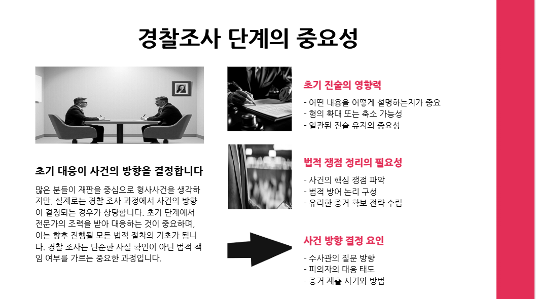 많은 분들이 재판을 중심으로 생각하시지만, 실제로는 경찰 조사 과정에서 사건의 방향이 결정되는 경우가 상당합니다. 초기 진술에서 어떤 내용을 어떻게 설명하느냐에 따라 혐의가 확대되거나 반대로 정리될 수도 있습니다. 이 단계에서 법적 쟁점을 정리하지 못하면 이후 절차에서 불리한 위치에 놓이기 쉽습니다.