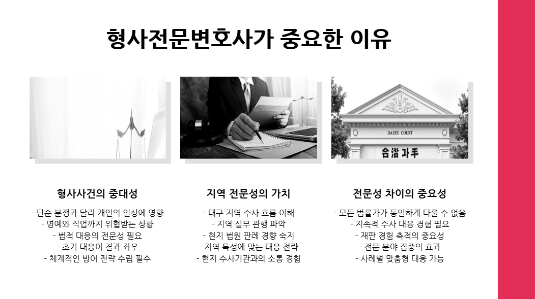 형사사건은 단순한 분쟁과 달리 개인의 일상과 명예, 직업까지 영향을 미칠 수 있는 중대한 문제입니다. 특히 대구 지역에서 형사 사건을 다뤄온 경험이 있는 전문가는 수사 흐름과 실무 관행을 정확히 이해하고 있습니다. 형사 분야는 모든 법률가가 동일하게 다룰 수 있는 영역이 아니며, 지속적으로 수사 대응과 재판 경험을 축적해 온 인력이 많지 않다는 점에서 전문성의 차이가 분명히 드러납니다.