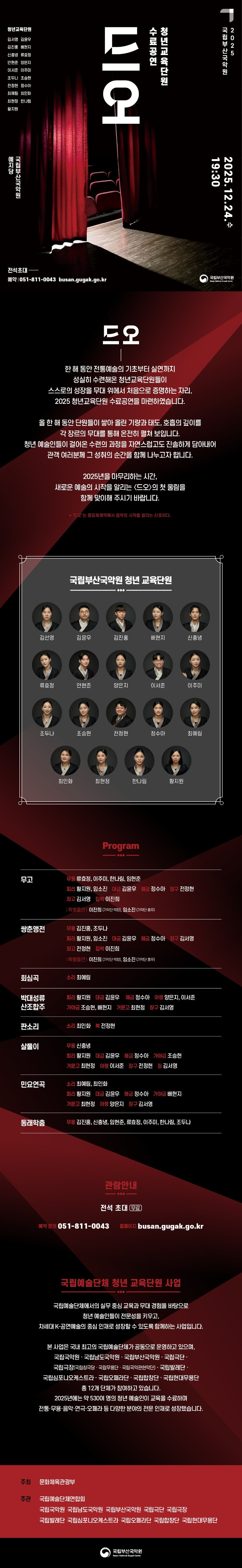 국립부산국악원 - 청년 교육단원 수료공연 작성자최영재|작성시간25.12.16|조회수41 목록 댓글 0 글자크기 작게가 글자크기 크게가 다음검색 현재 게시글 추가 기능 열기 북마크 공유하기 신고 센터로 신고 댓글 댓글 0 댓글쓰기 답글쓰기 댓글 리스트