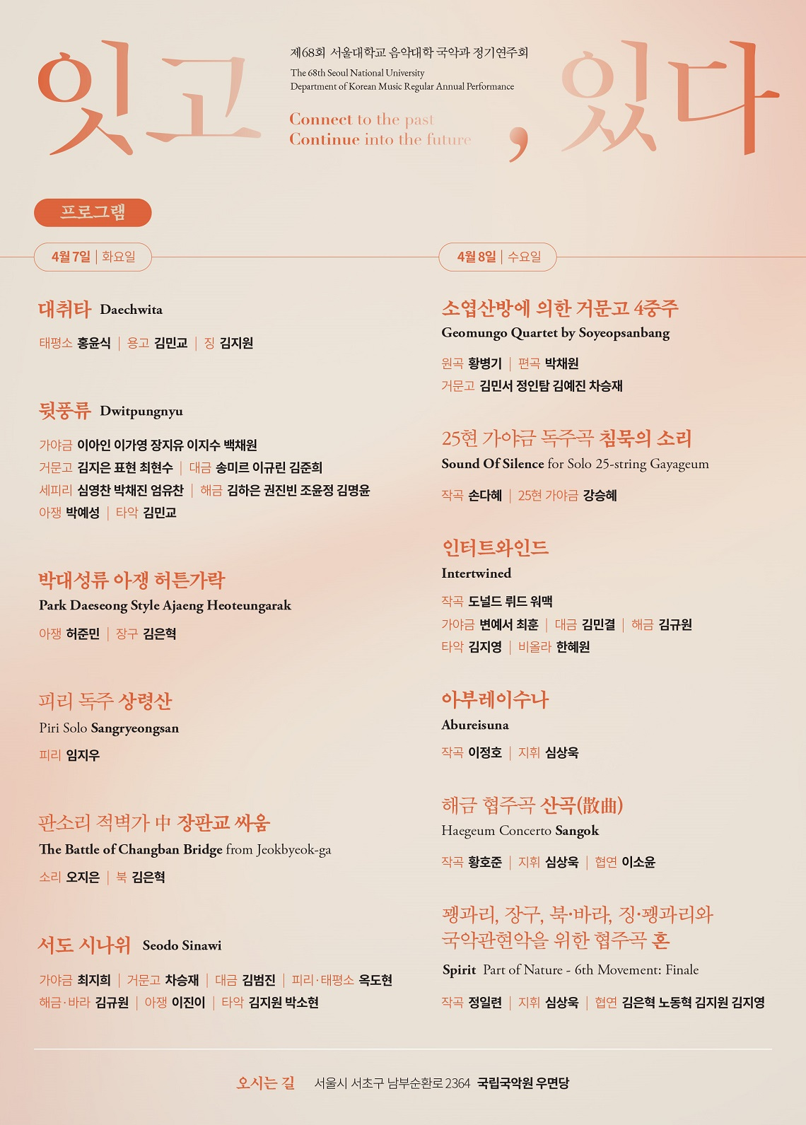 서울대학교 국악과 - 정기연주회 작성자최영재|작성시간26.04.02|조회수24 목록 댓글 0 글자크기 작게가 글자크기 크게가 전석 초대문의전화 = 02-880-7982 다음검색 현재 게시글 추가 기능 열기 북마크 공유하기 신고 센터로 신고 댓글 댓글 0 댓글쓰기 답글쓰기 댓글 리스트