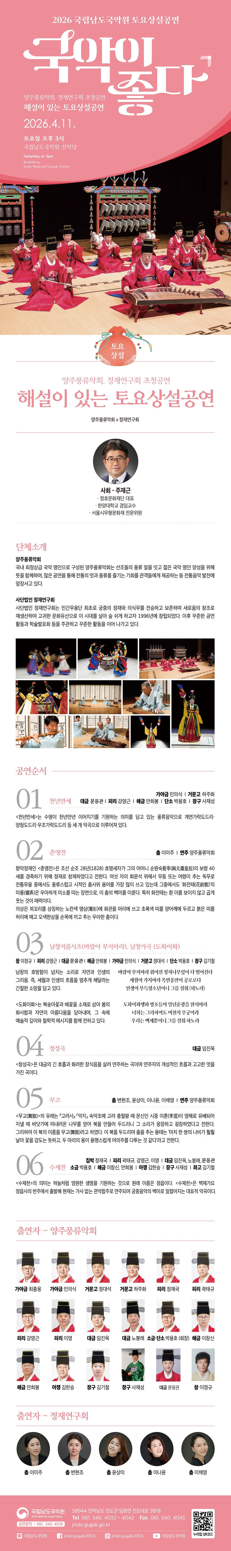 국립남도국악원 <국악이 좋다> 작성자최영재|작성시간26.04.06|조회수9 목록 댓글 0 글자크기 작게가 글자크기 크게가 관람료 무료 다음검색 현재 게시글 추가 기능 열기 북마크 공유하기 신고 센터로 신고 댓글 댓글 0 댓글쓰기 답글쓰기 댓글 리스트