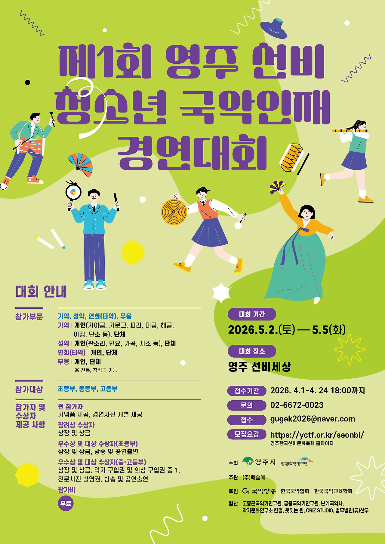 영주 선비 청소년 국악인재 경연대회 작성자최영재|작성시간26.04.07|조회수8 목록 댓글 0 글자크기 작게가 글자크기 크게가 축제 홈페이지 바로가기https://yctf.or.kr/seonbi/ 다음검색 현재 게시글 추가 기능 열기 북마크 공유하기 신고 센터로 신고 댓글 댓글 0 댓글쓰기 답글쓰기 댓글 리스트
