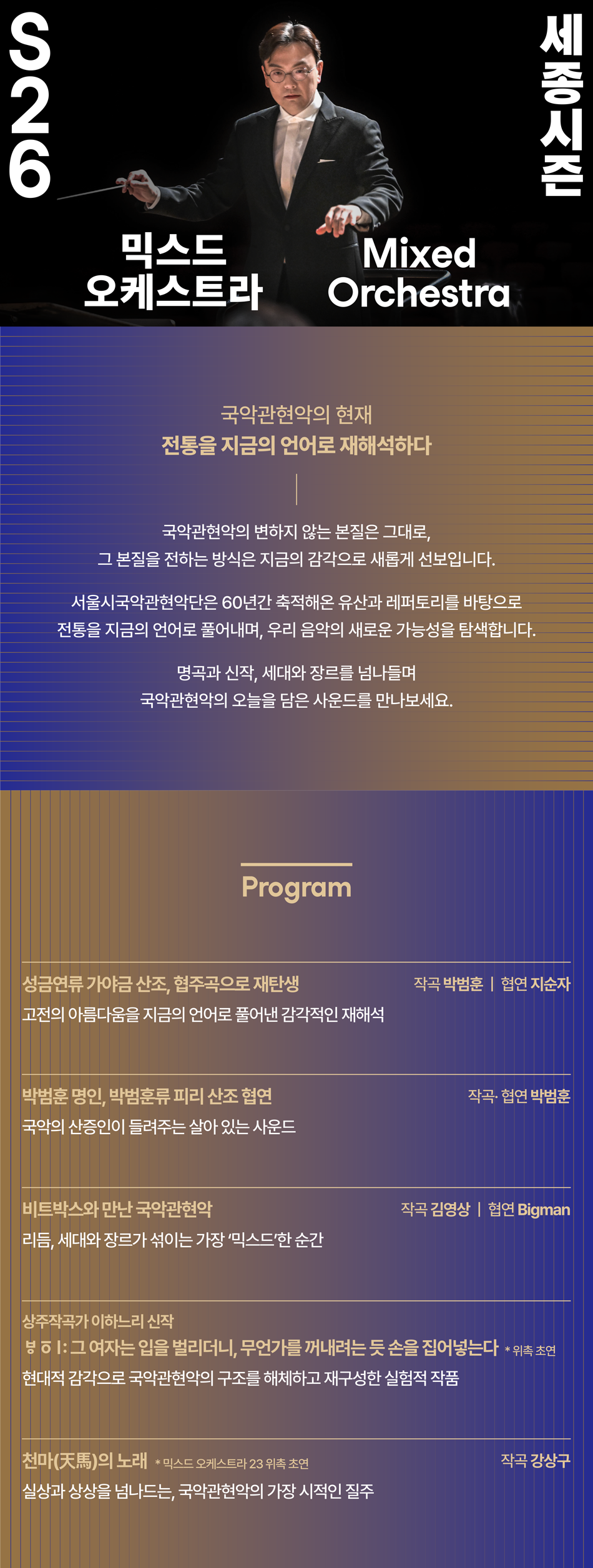 서울시립 국악관현악단 - 믹스드 오케스트라 26 작성자최영재|작성시간26.04.08|조회수4 목록 댓글 0 글자크기 작게가 글자크기 크게가 100분(인터미션: 15분)7세 이상 관람 가능(2019년 이전 출생자)R석50,000원S석40,000원A석30,000원세종문화티켓02-399-1000 다음검색 현재 게시글 추가 기능 열기 북마크 공유하기 신고 센터로 신고 댓글 댓글 0 댓글쓰기 답글쓰기 댓글 리스트