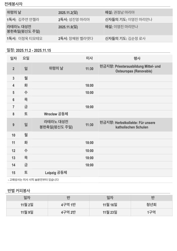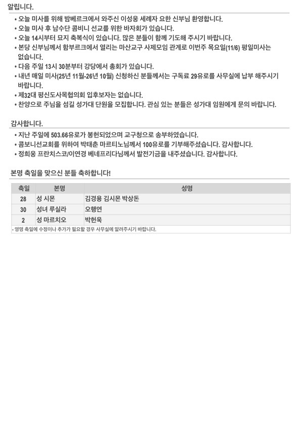 2025년 위령의 날 주보입니다. 작성자김민덕 안젤라|작성시간25.11.02|조회수96 목록 댓글 0 글자크기 작게가 글자크기 크게가 20251102.pdf592.87KB 첨부파일첨부된 파일이 5개 있습니다. jpg 파일 202511022.jpg 다운로드 jpg 파일 202511021.jpg 다운로드 jpg 파일 202511023.jpg 다운로드 jpg 파일 202511024.jpg 다운로드 pdf 파일 20251102.pdf 다운로드 다음검색 현재 게시글 추가 기능 열기 북마크 공유하기 신고 센터로 신고 댓글 댓글 0 댓글쓰기 답글쓰기 댓글 리스트