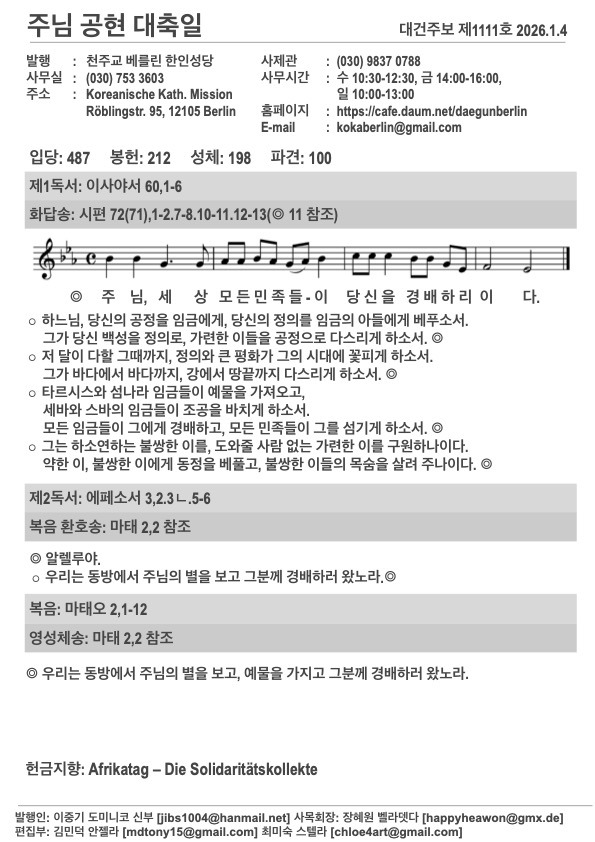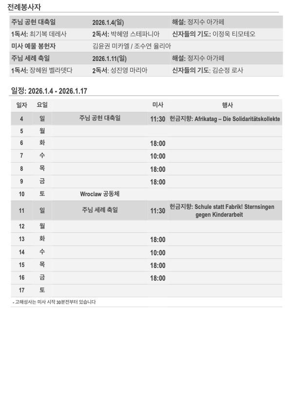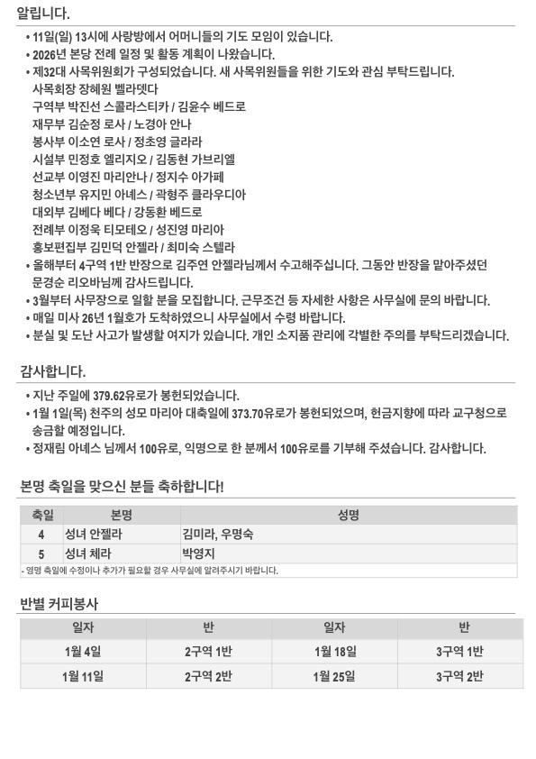2026년 주님 공현 대축일 주보입니다. 작성자김민덕 안젤라|작성시간26.01.04|조회수132 목록 댓글 0 글자크기 작게가 글자크기 크게가 20260104.pdf558.92KB 첨부파일첨부된 파일이 5개 있습니다. jpg 파일 202601044.jpg 다운로드 jpg 파일 202601041.jpg 다운로드 jpg 파일 202601042.jpg 다운로드 jpg 파일 202601043.jpg 다운로드 pdf 파일 20260104.pdf 다운로드 다음검색 현재 게시글 추가 기능 열기 북마크 공유하기 신고 센터로 신고 댓글 댓글 0 댓글쓰기 답글쓰기 댓글 리스트