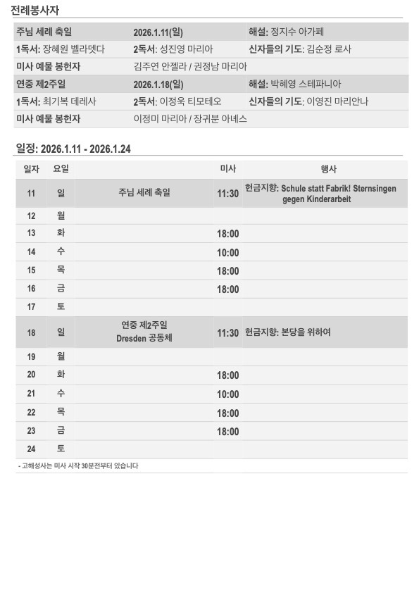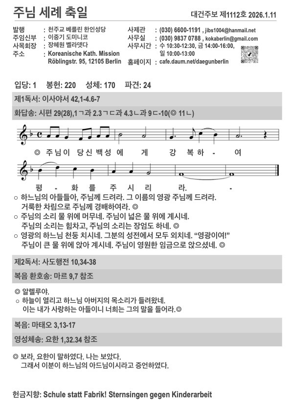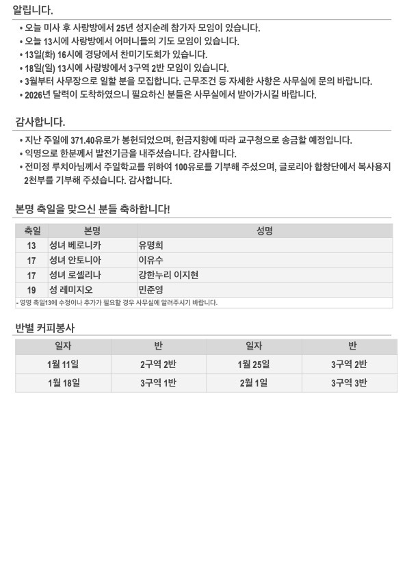 2026년 주님 세례 축일 주보입니다. 작성자김민덕 안젤라|작성시간26.01.11|조회수130 목록 댓글 0 글자크기 작게가 글자크기 크게가 20260111.pdf558.56KB 첨부파일첨부된 파일이 5개 있습니다. jpg 파일 202601112.jpg 다운로드 jpg 파일 202601114.jpg 다운로드 jpg 파일 202601111.jpg 다운로드 jpg 파일 202601113.jpg 다운로드 pdf 파일 20260111.pdf 다운로드 다음검색 현재 게시글 추가 기능 열기 북마크 공유하기 신고 센터로 신고 댓글 댓글 0 댓글쓰기 답글쓰기 댓글 리스트