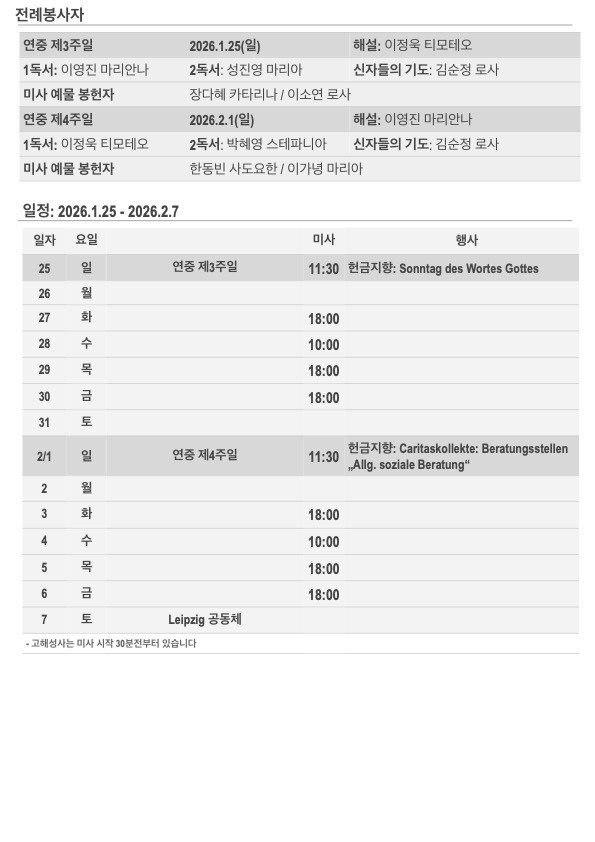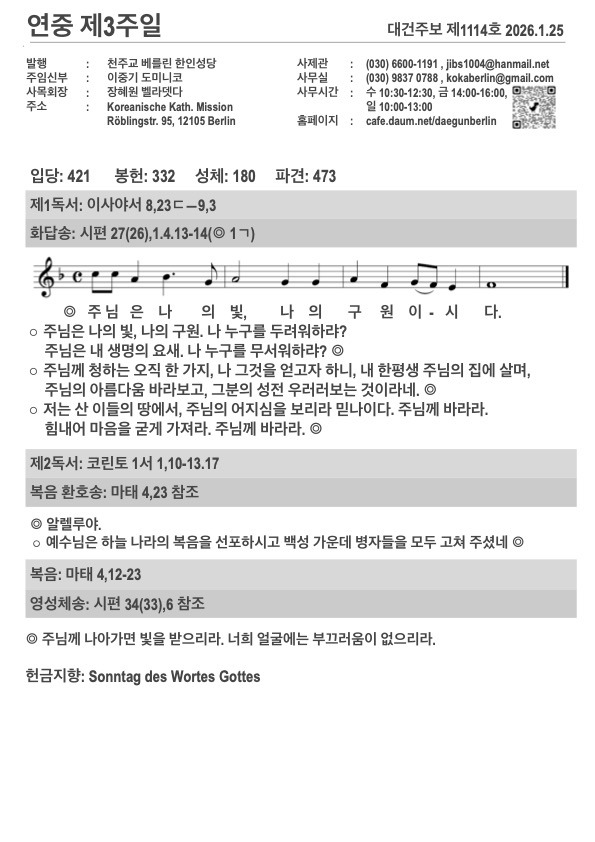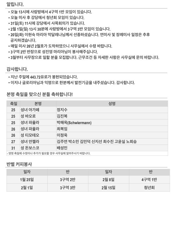 2026년 연중 제3주일 주보입니다. 작성자김민덕 안젤라|작성시간26.01.25|조회수132 목록 댓글 0 글자크기 작게가 글자크기 크게가 20260125.pdf554.81KB 첨부파일첨부된 파일이 5개 있습니다. jpg 파일 202601251.jpg 다운로드 jpg 파일 202601252.jpg 다운로드 jpg 파일 202601253.jpg 다운로드 jpg 파일 202601254.jpg 다운로드 pdf 파일 20260125.pdf 다운로드 다음검색 현재 게시글 추가 기능 열기 북마크 공유하기 신고 센터로 신고 댓글 댓글 0 댓글쓰기 답글쓰기 댓글 리스트