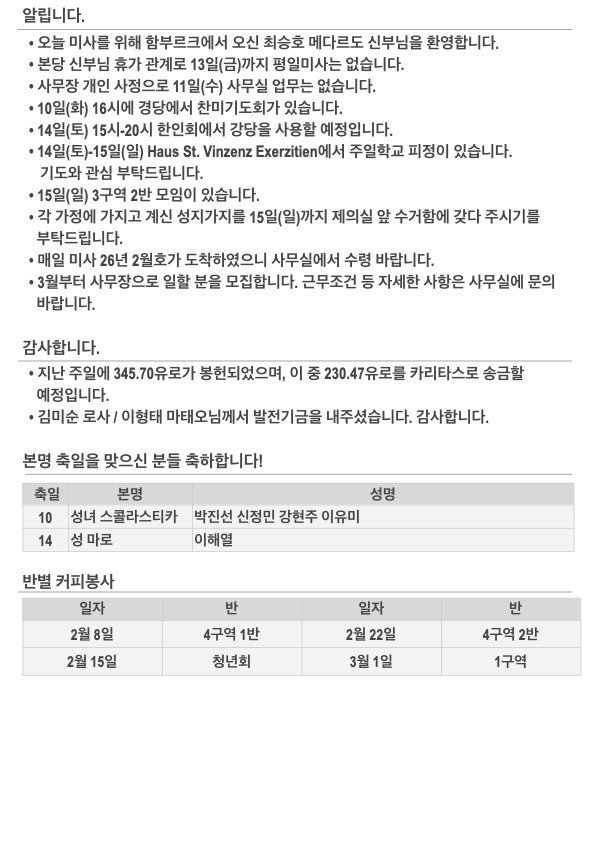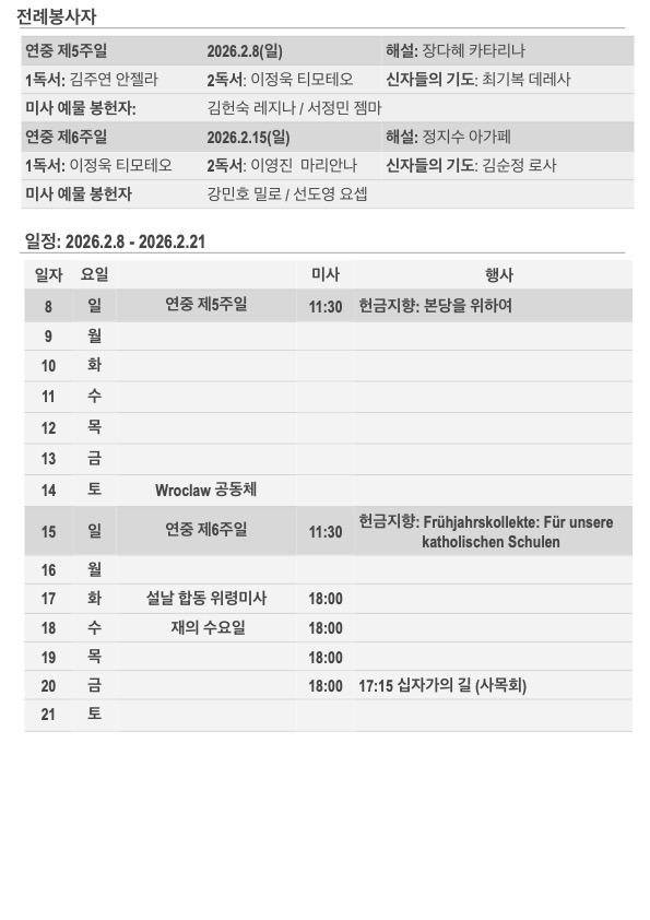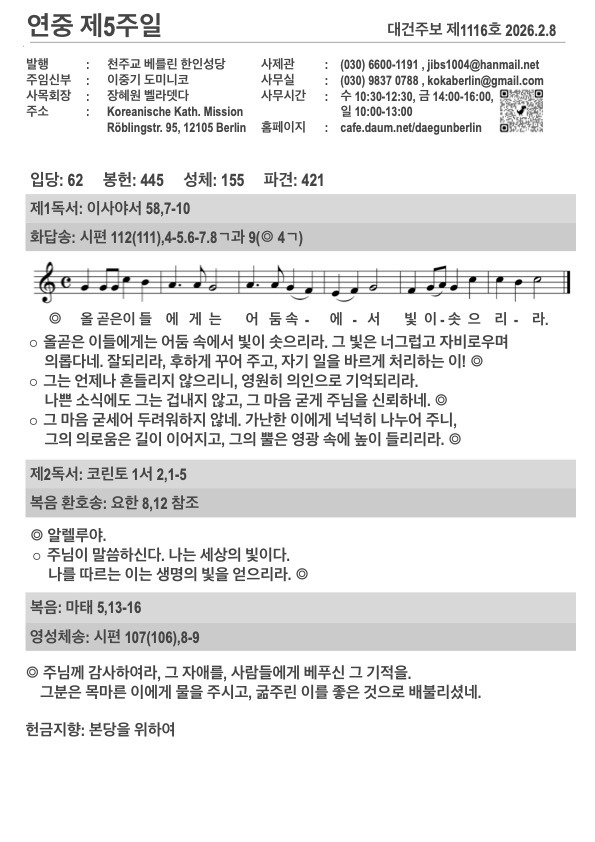 2026년 연중 제5주일 주보입니다. 작성자김민덕 안젤라|작성시간26.02.08|조회수128 목록 댓글 0 글자크기 작게가 글자크기 크게가 20260208.pdf477.08KB 첨부파일첨부된 파일이 5개 있습니다. jpg 파일 202602082.jpg 다운로드 jpg 파일 202602081.jpg 다운로드 jpg 파일 202602084.jpg 다운로드 jpg 파일 202602083.jpg 다운로드 pdf 파일 20260208.pdf 다운로드 다음검색 현재 게시글 추가 기능 열기 북마크 공유하기 신고 센터로 신고 댓글 댓글 0 댓글쓰기 답글쓰기 댓글 리스트