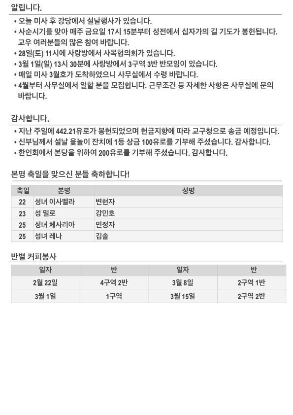 2026년 사순 제1주일 주보입니다. 작성자김민덕 안젤라|작성시간26.02.22|조회수118 목록 댓글 0 글자크기 작게가 글자크기 크게가 20260222.pdf396.02KB 첨부파일첨부된 파일이 5개 있습니다. jpg 파일 202602221.jpg 다운로드 jpg 파일 202602222.jpg 다운로드 jpg 파일 202602223.jpg 다운로드 jpg 파일 202602224.jpg 다운로드 pdf 파일 20260222.pdf 다운로드 다음검색 현재 게시글 추가 기능 열기 북마크 공유하기 신고 센터로 신고 댓글 댓글 0 댓글쓰기 답글쓰기 댓글 리스트