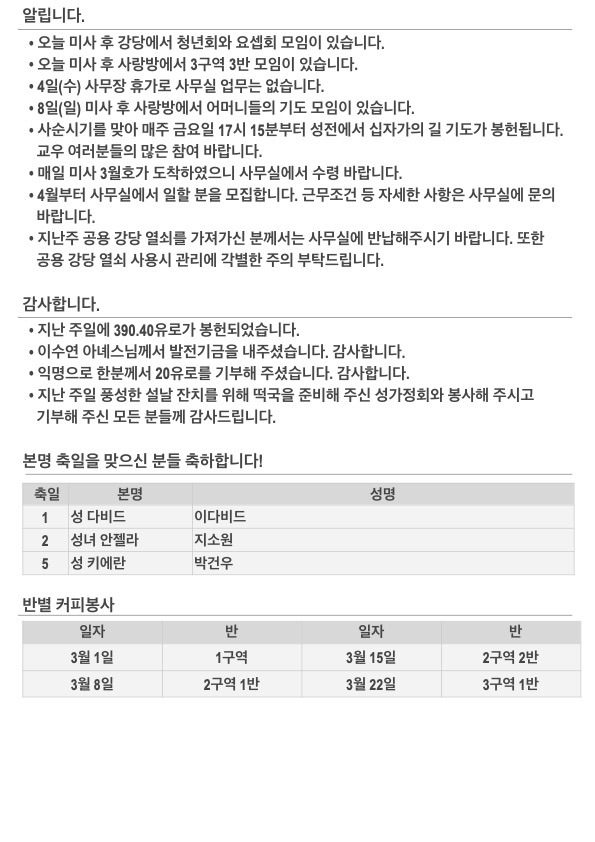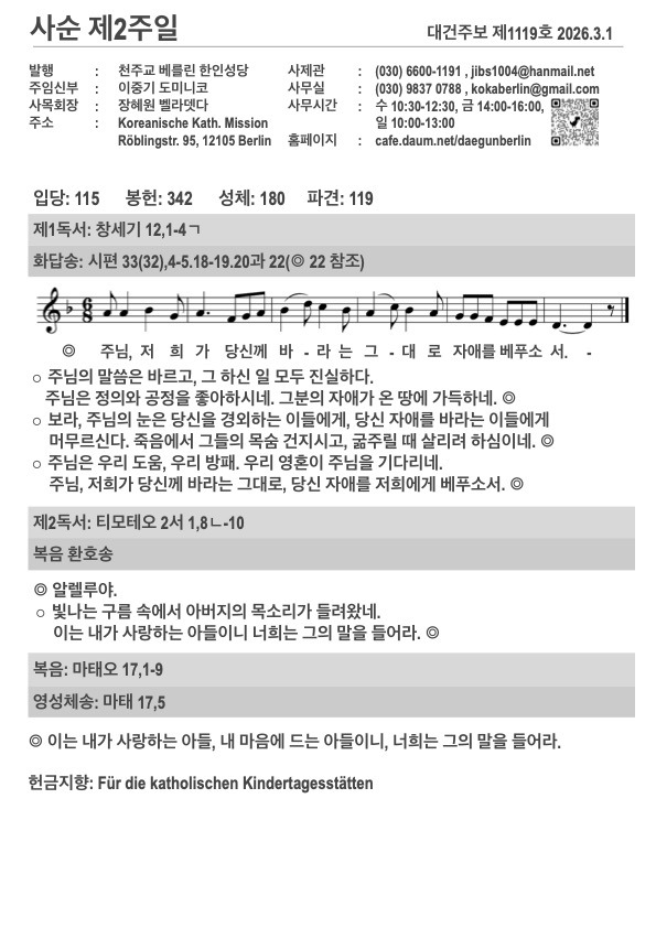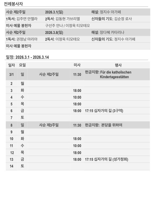 2026년 사순 제2주일 주보입니다. 작성자김민덕 안젤라|작성시간26.03.01|조회수118 목록 댓글 0 글자크기 작게가 글자크기 크게가 20260301.pdf423.55KB 첨부파일첨부된 파일이 5개 있습니다. jpg 파일 202603011.jpg 다운로드 jpg 파일 202603012.jpg 다운로드 jpg 파일 202603013.jpg 다운로드 jpg 파일 202603014.jpg 다운로드 pdf 파일 20260301.pdf 다운로드 다음검색 현재 게시글 추가 기능 열기 북마크 공유하기 신고 센터로 신고 댓글 댓글 0 댓글쓰기 답글쓰기 댓글 리스트