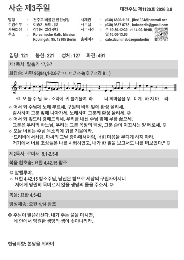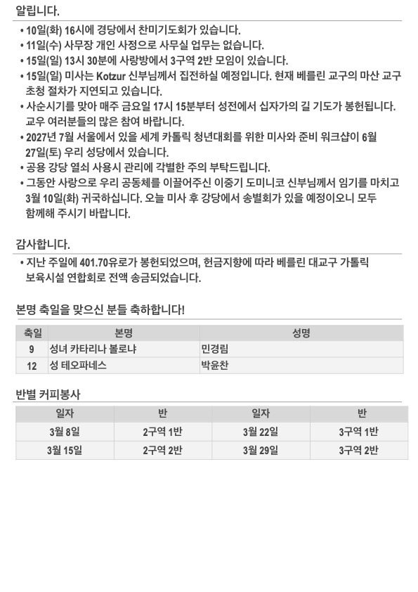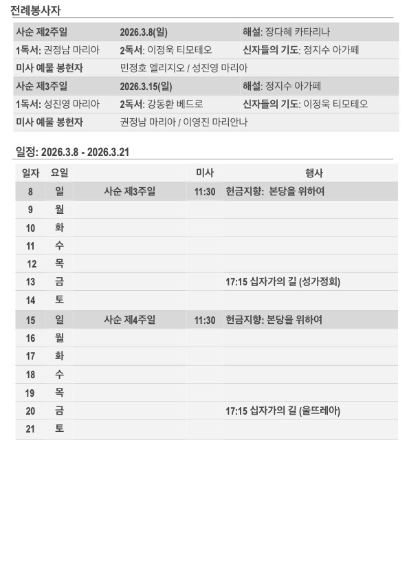 2026년 사순 제3주일 주보입니다. 작성자김민덕 안젤라|작성시간26.03.08|조회수120 목록 댓글 0 글자크기 작게가 글자크기 크게가 20260308.pdf426.75KB 첨부파일첨부된 파일이 5개 있습니다. jpg 파일 202603081.jpg 다운로드 jpg 파일 202603082.jpg 다운로드 jpg 파일 202603083.jpg 다운로드 jpg 파일 202603084.jpg 다운로드 pdf 파일 20260308.pdf 다운로드 다음검색 현재 게시글 추가 기능 열기 북마크 공유하기 신고 센터로 신고 댓글 댓글 0 댓글쓰기 답글쓰기 댓글 리스트