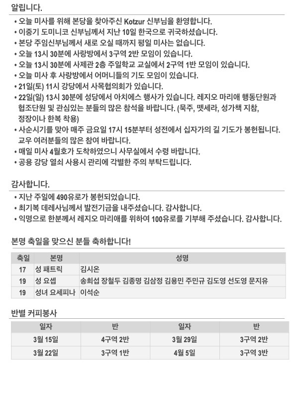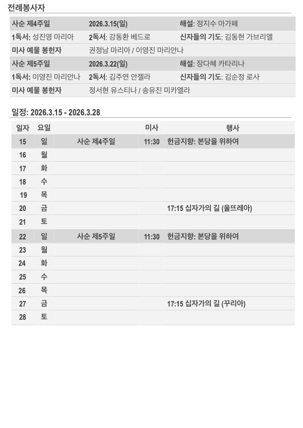 2026년 사순 제4주일 주보입니다. 작성자김민덕 안젤라|작성시간26.03.15|조회수98 목록 댓글 0 글자크기 작게가 글자크기 크게가 20260315.pdf423.70KB 첨부파일첨부된 파일이 5개 있습니다. jpg 파일 202603152.jpg 다운로드 jpg 파일 202603151.jpg 다운로드 jpg 파일 202603154.jpg 다운로드 jpg 파일 202603153.jpg 다운로드 pdf 파일 20260315.pdf 다운로드 다음검색 현재 게시글 추가 기능 열기 북마크 공유하기 신고 센터로 신고 댓글 댓글 0 댓글쓰기 답글쓰기 댓글 리스트