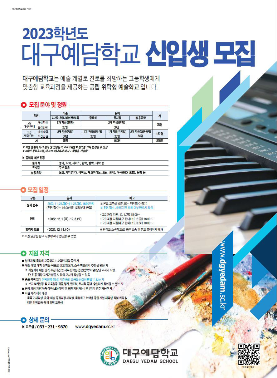 2023학년도 대구예담학교 신입생 모집 작성자백윤용|작성시간22.10.20|조회수230 목록 댓글 0 글자크기 작게가 글자크기 크게가 학교설명회: 2022. 11. 5.(토) 10:00~12:00 장소: 대구예담학교면접일: 2022. 12. 1.(목) ~ 12. 3.(토) 다음검색 현재 게시글 추가 기능 열기 북마크 공유하기 신고 센터로 신고 댓글 댓글 0 댓글쓰기 답글쓰기 댓글 리스트