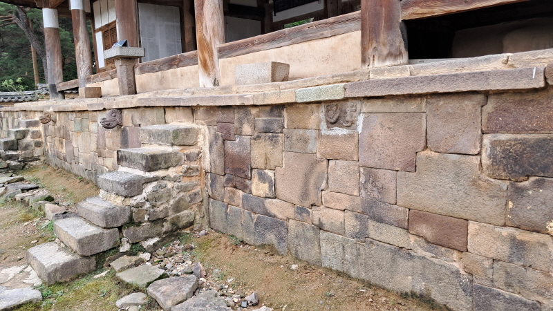 강당의 정면 기단에는 여의주와 물고기를 물고 있는 용머리 4개와 다람쥐 모양의 동물이