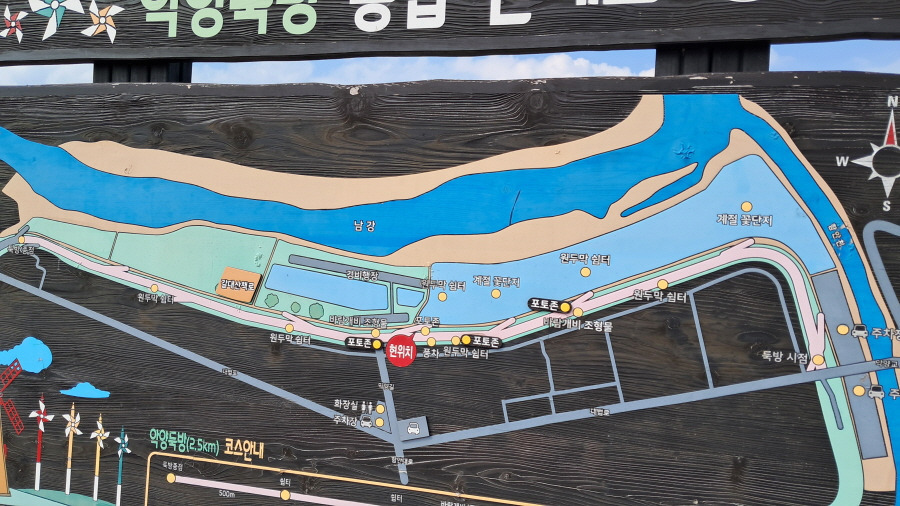 은 왕복 6.5km이고, 둑방과 둔치 꽃이 피어 있는 구간의 길이는 2.7km 정도, 왕복 소요 시간은 2시간 안팎이다