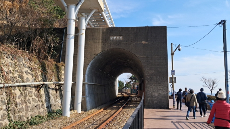 '달맞이터널' 해변열차가 개설되기 전 폐선일 때는 터널을 통과하는 철길을 걸었는데 현재는 통행금지입니다