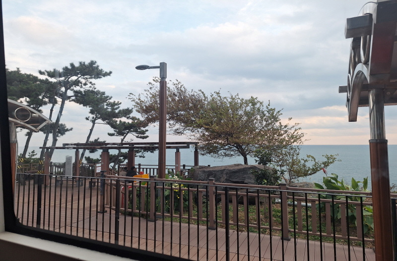 바다소리갤러리 아래 해안 바위생김이 멀리서는 하트, 갤러리 입구 전망대에서는 악어머리 모양을 보입니다