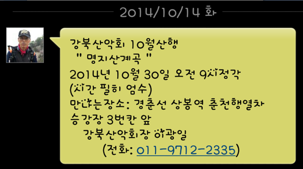[강북산악회] 10월 단풍산행 예고 - 명지산계곡.가평적목리 용수목계곡 작성자임응빈|작성시간14.10.14|조회수102 목록 댓글 0 글자크기 작게가 글자크기 크게가 10월 30일은 목요일입니다 다음검색 현재 게시글 추가 기능 열기 북마크 공유하기 신고 센터로 신고 댓글 댓글 0 댓글쓰기 답글쓰기 댓글 리스트