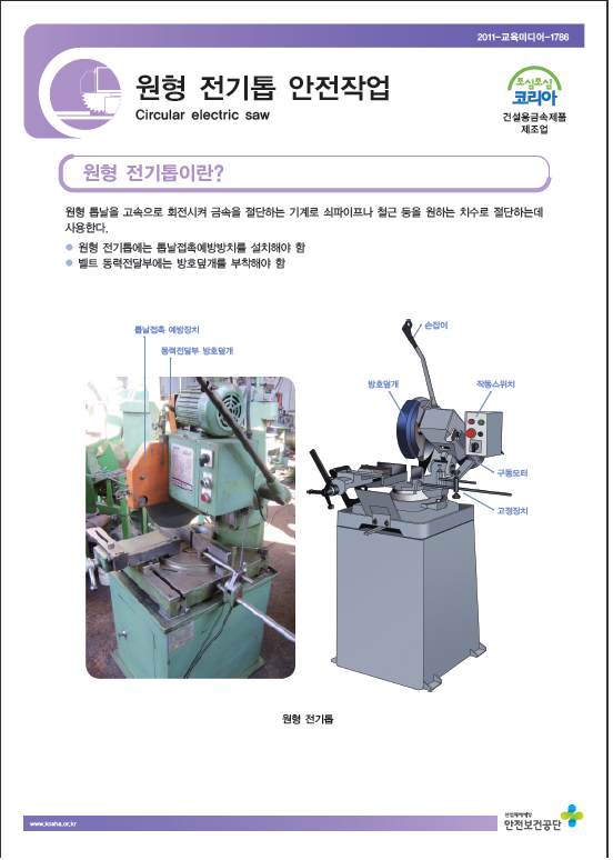 - 절단작업시 작업자의 손이 원형톱날에 접촉되지 않도록 톱날접촉 예방장치를 설치