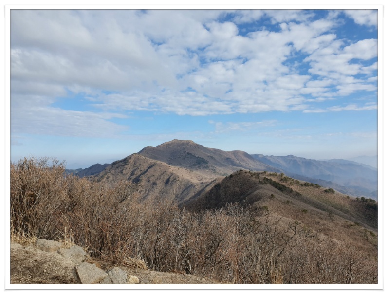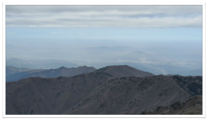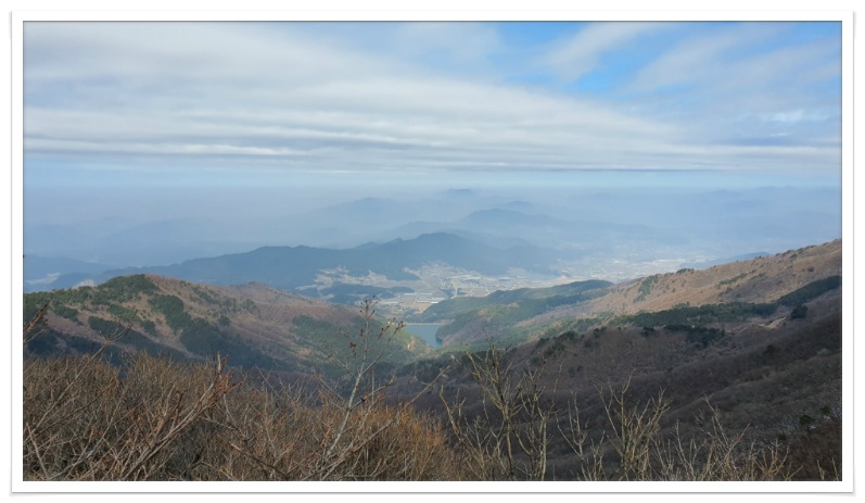 우측 산내면 골짜기 중앙 멀리 임천지맥의 삼봉산이 우뚝하고.....