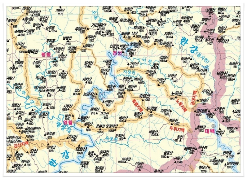 한강이 큰 골을 이루고 오대천, 평창강, 주천강, 섬강, 지장천, 옥동천, 달천 등이 작은 골을 이뤄 큰 물 한강에 합수됩니다.