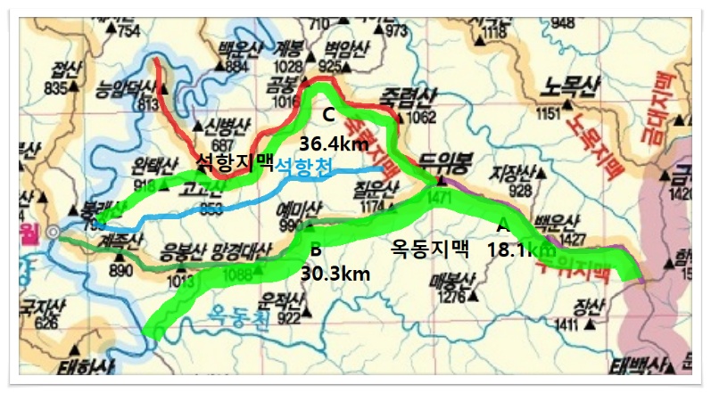 그런데 이 옥동천과 두위지맥이라고 불리는 가지줄기 그리고 죽렴지맥이라고 불리는 또 다른 가지줄기와 그 사이에서 발원하는 석항천과의 관계가 궁금해 집니다.