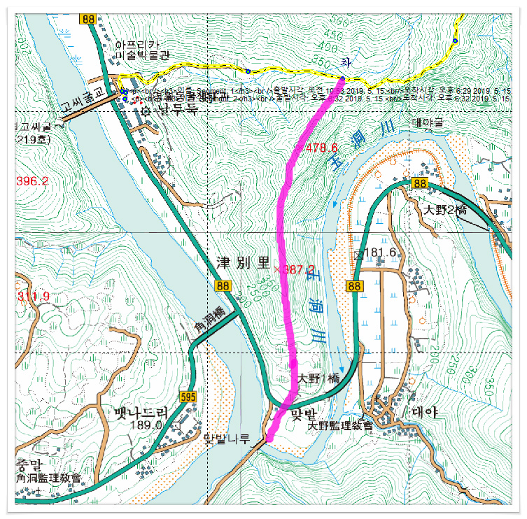 원래 핑크색 방향으로 진행을 하여 약 1.5km 정도를 더 가야 하는데 시간 상 뒤로 미루기로 합니다.