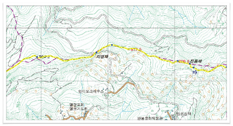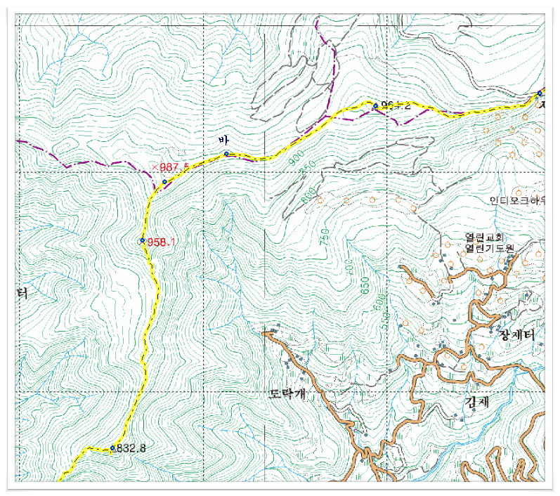여기서 이해를 돕고자 이 두위지맥의 바로 위에 있는 지맥을 그 예로 보도록 합니다.