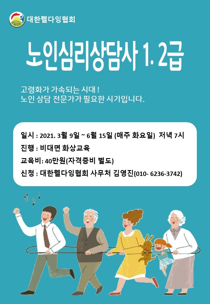 우리나라는 현재 고령화사회가 빠르게 진행되고, 노후가 길어지면서 질병과 빈곤, 고독 등의 문제가 점점 심각해지고 있습니다. 이러한 복합적인 문제를 함께 풀어내며 도움을 줄수 있는 중요한 역할을 하는 "노인심리상담사" 여러분 지금 시작합시다!!