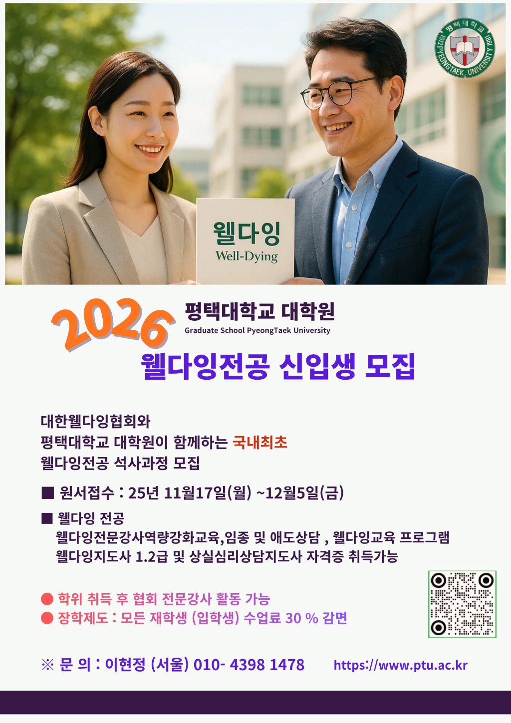 평택대 대학원 웰다잉 석사과정 작성자김광식전문위원|작성시간25.11.21|조회수13 목록 댓글 0 글자크기 작게가 글자크기 크게가 #공통<웰다잉전공 석사과정 소식>평택대 대학원 웰다잉 석사과정평택대학교 대학원 2026학년도신입생을 모집하니 많은 지원바랍니다. 다음검색 현재 게시글 추가 기능 열기 북마크 공유하기 신고 센터로 신고 댓글 댓글 0 댓글쓰기 답글쓰기 댓글 리스트