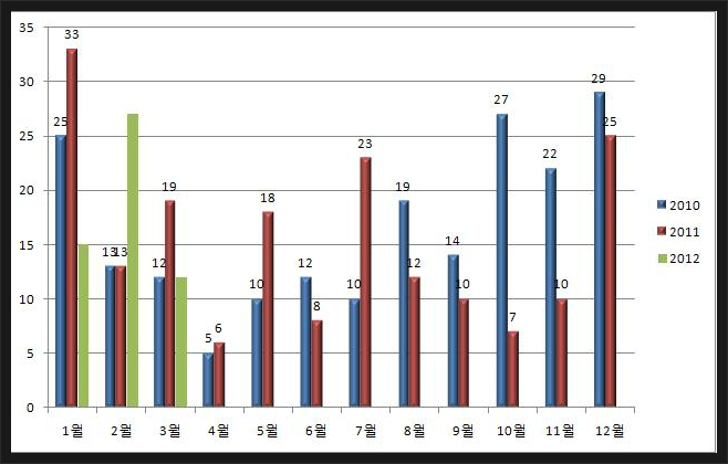 위의자료는 최근 3년간의 거래량을 도표화해서 나타낸 것입니다. 2월경에 거래량이 증폭되면