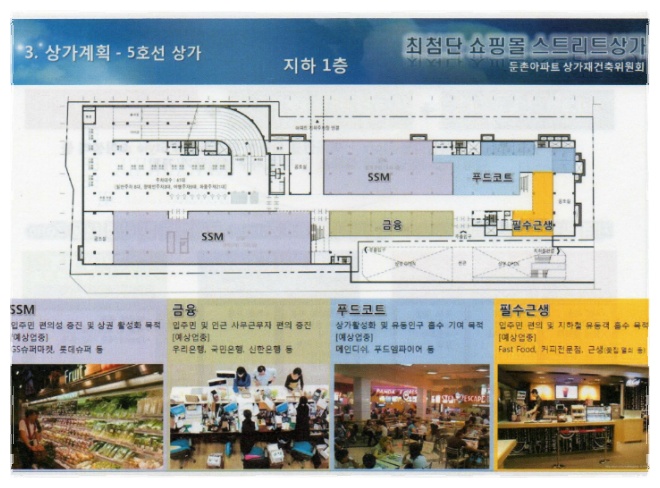 특히 지하층의 경우 지금현재 종합상가에 있는 농협과 GS슈퍼를 그대로 입점을 시키는 방식으로 하고, 푸드코트를 구성하여 상가 활성화 하는데 있어서 상당히 기여할 전망이다. 그리고, 지하공간 형태가 코엑스아트몰과 유사한 오픈스페이스 형태(썬큰광장)로 계획되기 때문에 지하에서도 충분한 임대가치가 나올 전망이다.