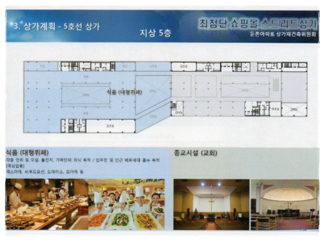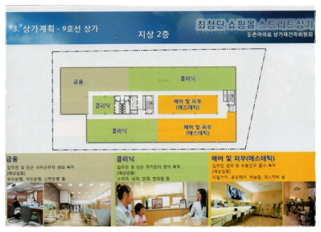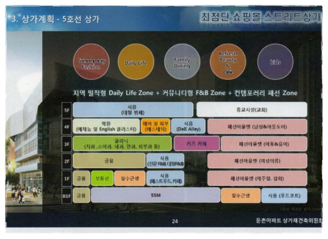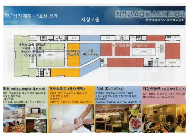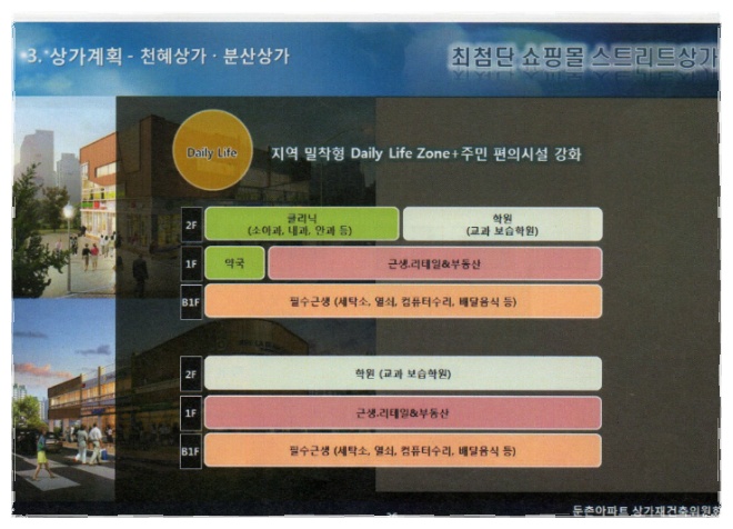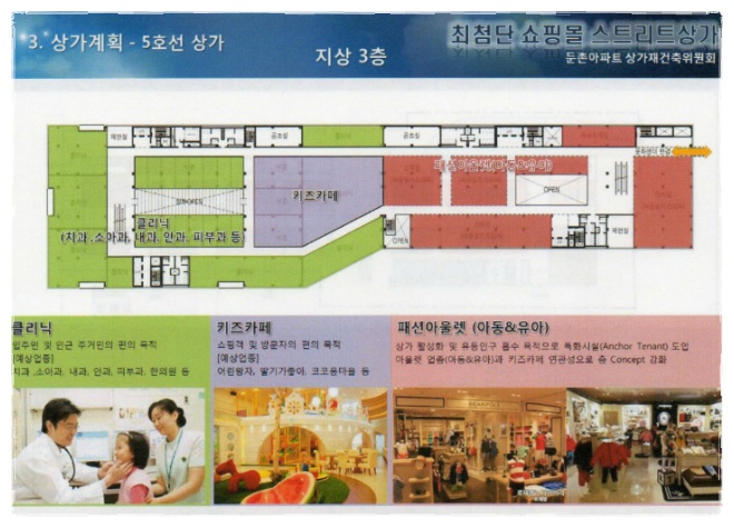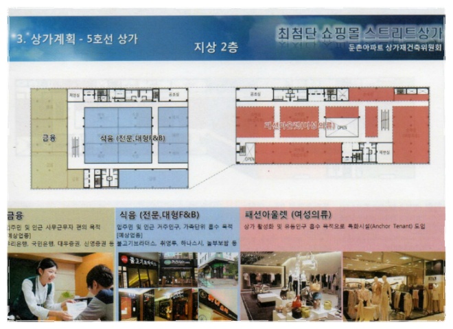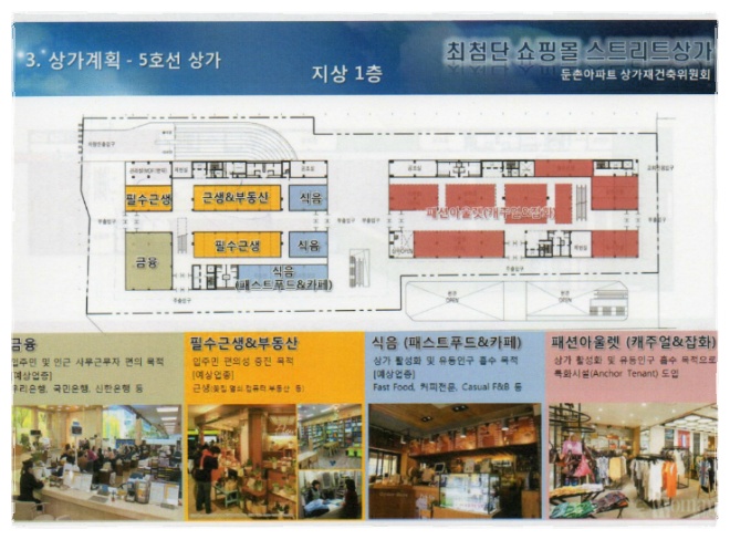 가-나동이 연결되는 스트리트 상가형태로 구성되고 가동은 둔촌주공아파트와 관련한 병원.약국.금융기관.학원.고급식당가등 필수근생관련 업체들로 구성을 하고... 나동은 패션아울렛몰(1층은 캐쥬얼 및 잡화. 2층은 여성의류. 3층은 아동 및 유아관련 4층은 남성의류 및 아웃도어) 형태로 구성을 할것으로 보여진다.