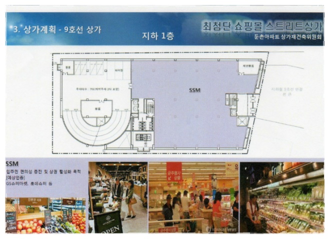 9호선 상가의 경우... 지하층으로 5호선상가와 마찬가지로 썬큰광장의 형태로 직접연결이 될것으로 보여진다. 그리고, 이곳에는 아래의 자료를 살펴보면 SSM이 지하면적 전체를 차지하고 있다. 아직은 확정되지 않았지만... 아마도 롯데마트등의 대형마트가 구성되지 않을까 유추해볼수가 있겠다. 그리고, 강남권과 직접연계성이 높은 9호선역이고 올림픽선수촌아파트의 유동인구를 생각해 볼때 9호선역 상가도 5호선역 메인상가 못지 않는 상가가 될것으로 보여진다.
