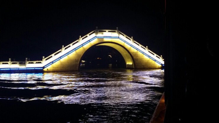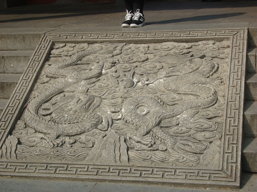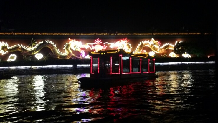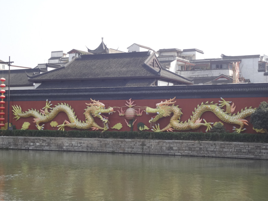 진회하 운하에 정박중인 유람선 이며 건너편 벽에 조각된 큰 용 두 마리 조각을