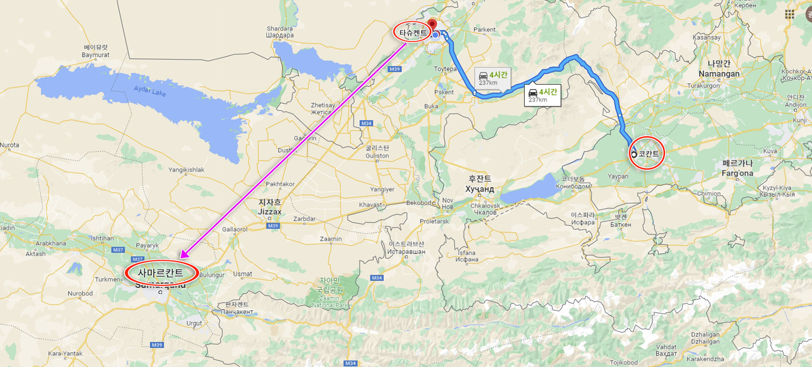 코칸드에서 타슈켄트까지는 약 240km 수준인데 4시간이 소요되고 타슈켄트에서 사마르칸트까지는 약 300km가 조금 넘는데 고속 열차로 약 2시간 10분이 걸린다.