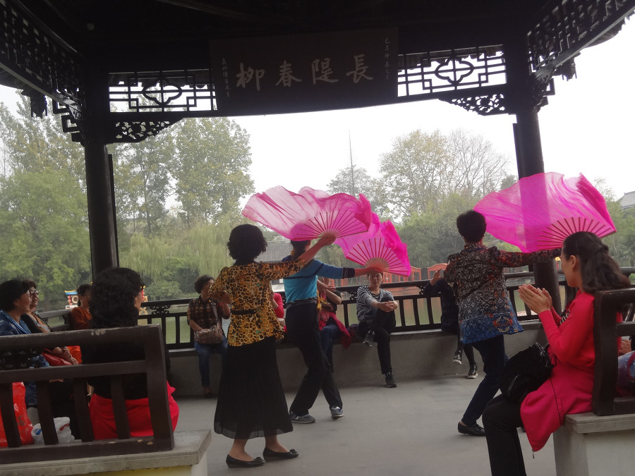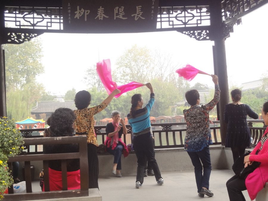 쓰거나 대오를 맞추어 태극권 을 수련하며, 공원에서 비파등 옛날 악기에 맞추어 노래