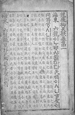 海東六龍 이 ᄂᆞᄅᆞ샤 일마다 天福 이시니 古聖 이 同符ᄒᆞ시니