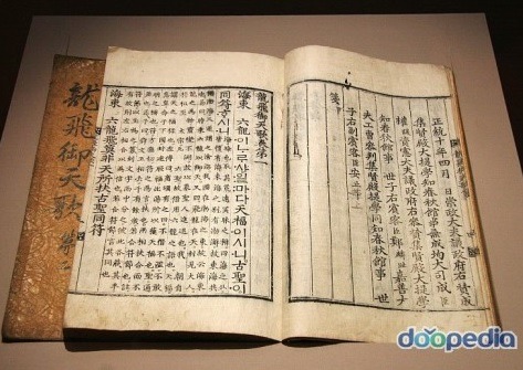 사용 하여 정인지 등이 지었으니 건국의 유래가 유구함과 조상들의 성덕을 찬송 했습니다.