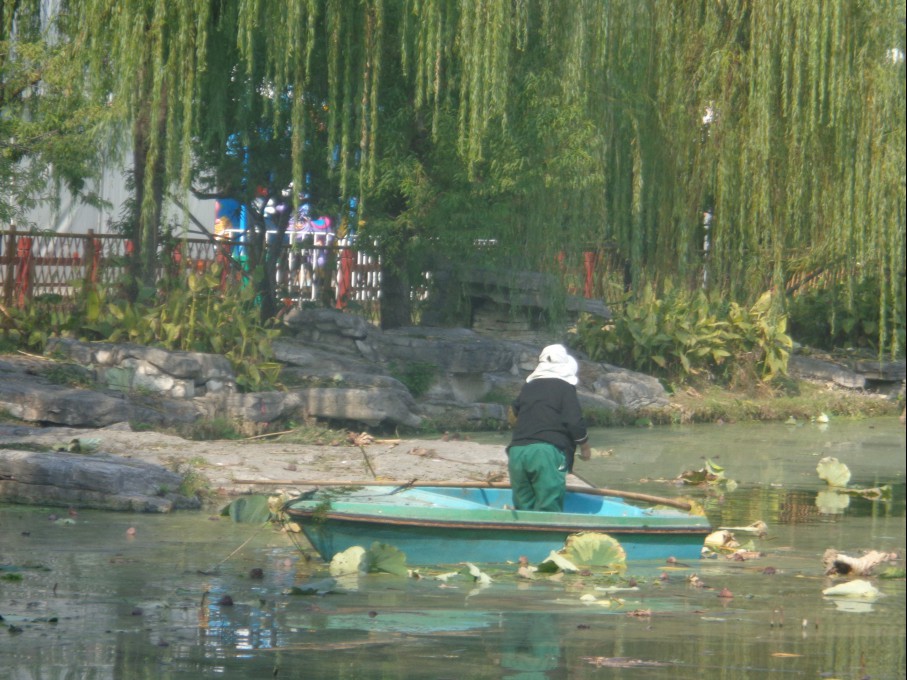 에는 이제 연꽃 이 시들어버린지라 직원들이 배를 타고 건져 올리는 모습을 봅니다.