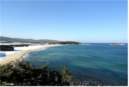 하얀 모래사장이 화진포 호수와 바다를 가르고, 그 끝에 해금강이 보인다.