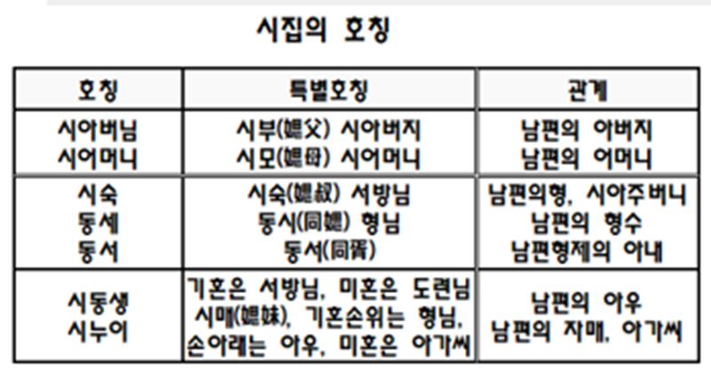 그리고 시숙은 남편의 형님에 대한 호칭. 또는 아주버님 혹은 아주범(뱀)이라고도 한다