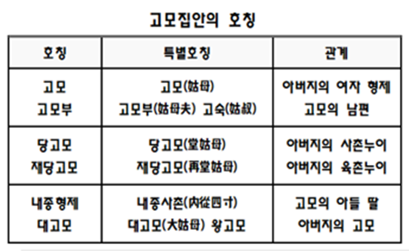 ㆍ처고모(妻姑母)는 아내의 고모, 처고종(妻姑從) - 아내의 고종,