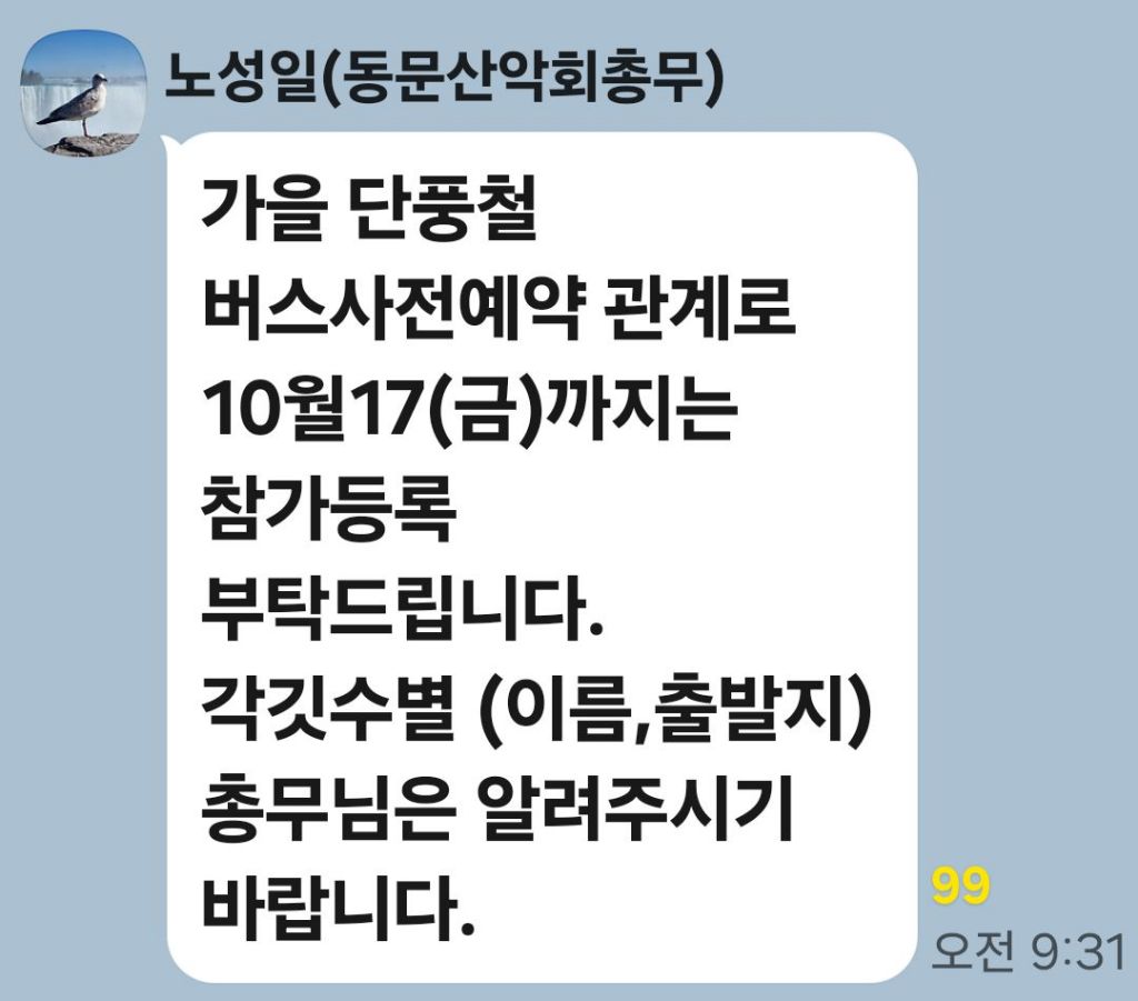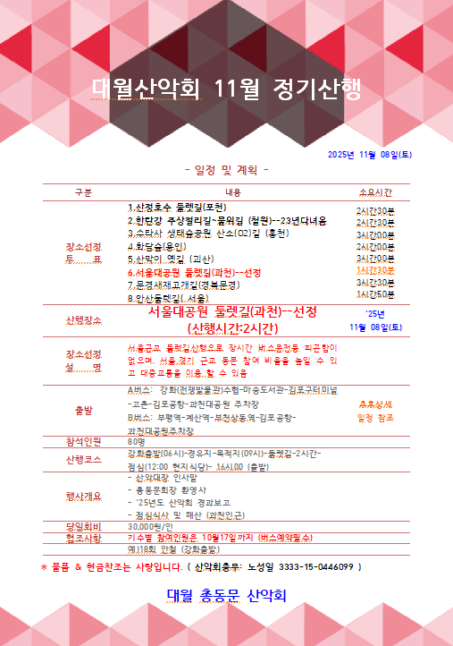 11월8(토)정기산행 알림! 작성자박미영(8회)|작성시간25.10.15|조회수73 목록 댓글 0 글자크기 작게가 글자크기 크게가 깊어가는 가을날을 동문 선후배가 또 함께로 만끽하는 날입니다.많은 참여로 건강한 웃음이 넘치시길!^^ 다음검색 현재 게시글 추가 기능 열기 북마크 신고 센터로 신고 댓글 댓글 0 댓글쓰기 답글쓰기 댓글 리스트