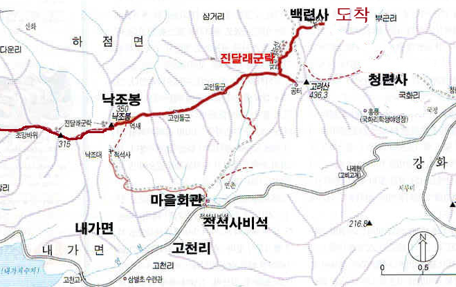 차량을 주차하고 적석사 능선타고 적석사 오르는길 타고 진달래 군락지에서 백년사로 가지말고 장보고 펜션으로 내려가면 됩니다.