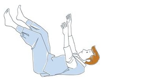 자리에 등을 대고 누워 양팔과 다리를 하늘 위로 들어올려줍니다.