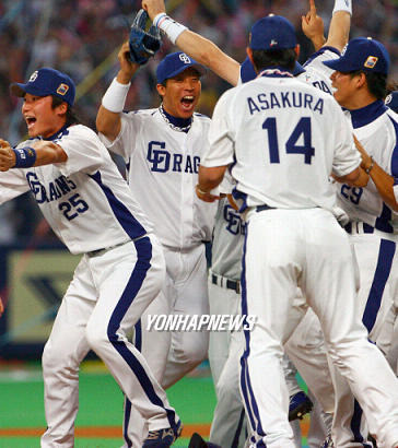 2007 일본시리즈 5차전에서 1대0으로 승리하며 챔피언에 오른 주니치. 이병규가 동료들과 함께 우승을 축하하고 있다. (사진 : 연합뉴스)