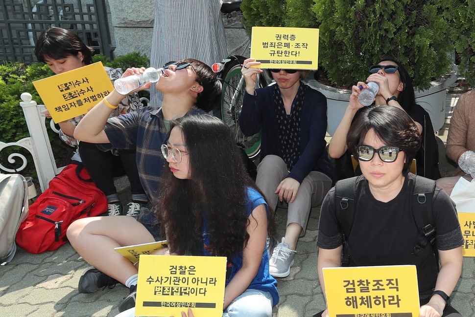 ▷ 본, 'Netizen Photo News' 는 가입 필요없이 손님께서도 연결에 넣어두고 날마다 보실 수 있습니다. (저작권 있음) '한국 네티즌본부' ◇ 한국여성민우회 등 9개 여성단체 대검찰청에서 기습시위 벌여 “이 사회에서 여성들은 더 이상 안전하고 평안한 삶을 누릴 수 없는 것” 한국여성민우회 여성단체회원들이 24일 오후 서울 서초구 대검찰청 민원실 앞에서 검찰을 규탄하는 구호를 외치며 기습 시위를 벌이자 검찰직원들이 이를 제지하고 있다. 강창광 기자 ○··· 한국여성민우회, 한국여성단체연합 등 9개 여성단체회원이 24일 오후 서울 서초구 대검찰청 내 민원실 앞에서 검찰을 규탄하는 기습시위를 벌였다. 이들은 예정된 대검찰청 앞 기자회견에 앞서 미리 준비한 `검찰조직 해체하라', `사법정의 무너뜨린 검찰 아웃' 등의 손팻말을 들고 구호를 외친 뒤 바닥에 앉아 연좌 농성을 벌였다. ◇ 이들은 “법무부 검찰 과거사위원회가 `고 장자연씨 사건'에 재수사를 권고하지 않고 김학의 전 차관은 성범죄 혐의가 제외된 채 구속 수사 중이다.”이라며 “검찰의 태도는 이 사건은 개인의 문제가 아니라 검찰조직 전체의 문제이며 공범이라는 것, <△ 사진:> 한국여성민우회 여성단체회원들이 24일 오후 서울 서초구 대검찰청 민원실 앞에서 연좌시위를 벌이고 있다. 강창광 기자 ○··· 이 사회에서 여성들은 더 이상 안전하고 평안한 삶을 누릴 수 없는 것을 확인하는 것”이라고 주장했다. 이날 기자회견을 연 단체는 한국여성민우회, 한국여성단체연합, 한국여성의전화, 한국성폭력상담소, 성매매문제해결을위한전국연대, 한국사이버성폭력대응센터, 수원여성회, 경기여성단체연합, 한국여성노동자회다. 현장의 사진을 모아본다. ○··· 연좌 농성하는 여성단체회원들 뒤로 대검 로비 벽면에 ‘검사 선서’가 걸려 있다. ○··· 한국여성민우회, 한국여성단체연합 등 9개 여성단체회원들이 24일 오후 서울 서초구 대검찰청 앞에서 검찰을 규탄하는 기자회견 도중 일부 참가자들이 물을 마시고 있다. 강창광 기자강창광 ☞ 원본글: 한겨레| Click ○←닷컴가기. |