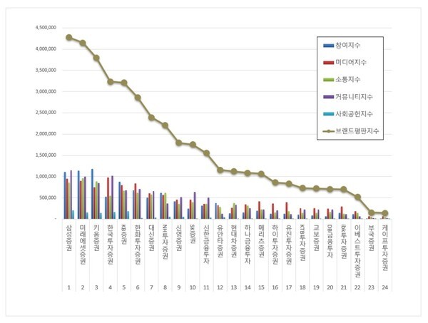 1위, 삼성증권 브랜드는 참여지수 1,113,090 미디어지수 945,546 소통지수 862,343 커뮤니티지수 1,151,403 사회공헌지수 203,802가 되면서 브랜드평판지수 4,276,184으로 분석됐다. 지난 12월 브랜드평판지수 3,934,653과 비교하면 8.68% 상승했다.